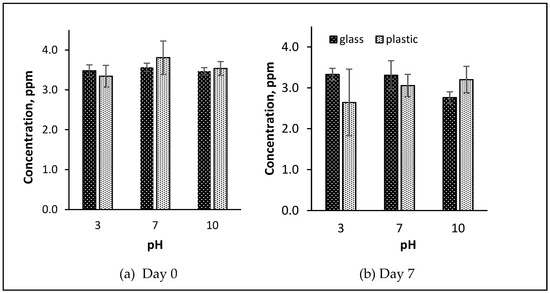 Effect of pH on Gβ2 concentrations in aqueous solutions with two container materials: (a) initial concentration and (b) concentrations after 7 days. The initial concentrations of Gβ2 used for experiments were ~300 ppm, the data shown reflect the dilution for analysis. The results are presented based on triplicates ± one standard deviation.