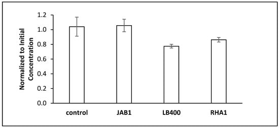 Gβ2 biodegradation was investigated for three different bacterial strains previously shown to break down aromatic pollutants [18]. No statistically significant degradation was observed for JAB1 after 72 h of incubation. Under similar conditions with LB400 and RHA1, the Gβ2 amount decreased by ~20% compared to the control with dead cells (Figure 2), showing a minor, yet statistically significant effect.