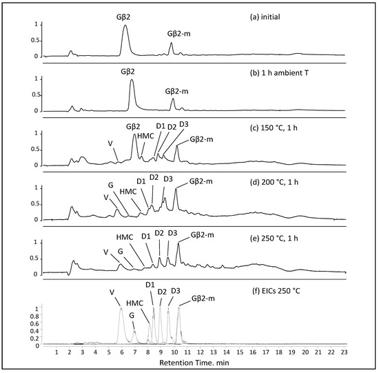 The HPLC-TOF-MS results demonstrated that Gβ2 undergoes a sizable conversion, even at 150 °C, while at 200 and 250 °C its conversion was complete. The same degradation products were observed at all three temperatures tested, but with different abundance. An extracted ion chromatogram confirming the identification of those products is provided as panel (f) of Figure 3.