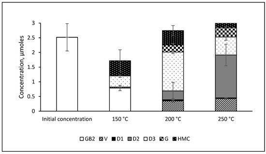 Reactant and product quantification was performed as described in the Section 2 to close mass balance. Figure 4 shows the determined amounts of both Gβ2 and its thermal degradation products. Gβ2 showed some stability at 150 °C whereas it was virtually gone at 200 and 250 °C. Conversely, the amounts of guaiacol (G) and vanillin (V) produced increased with temperature, as expected, assuming that higher temperature promotes decomposition reactions. However, unexpectedly, these two products of ether bond cleavage represented only two minor reaction pathways.