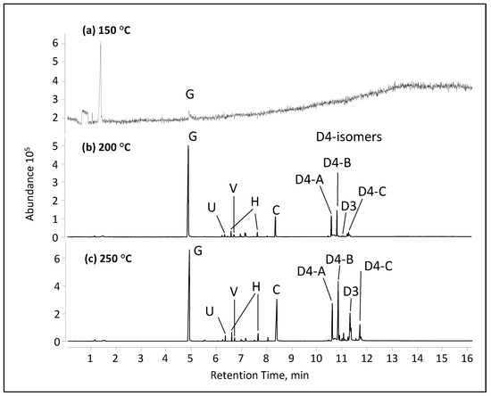 Figure 5 shows the Pyr-GC-MS TIC chromatograms obtained at three temperatures, 150, 200, and 250 °C. This information complements the other study, in which the pyrolysis of Gβ2 was investigated at much higher temperatures, 450, 550, 650, and 750 °C [31]. In contrast to our study, no dimers were detected in those high severity conditions, being replaced with catechols resulting from the scission of the other ether bond, within the methoxy group of Gβ2 [31]. The other study that investigated this process did not find any products but guaiacol at 200 and even 300 °C. Perhaps, the use of transfer lines in the Pyr-GC-MS setup precluded the detection of dimers and other less volatile products [32].