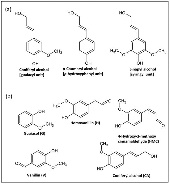 Chemical structures of phenolic monomers: (a). monolignols, the actual monomers of lignin synthesis and (b). examples of monoaromatic phenolic products of lignin degradation.