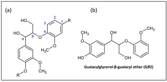 Chemical structures of: (a) general model compound featuring a β-O-4 linkage and (b) specific model compound, guaiacylglycerol-β-guaiacyl ether (Gβ2) used in this study.