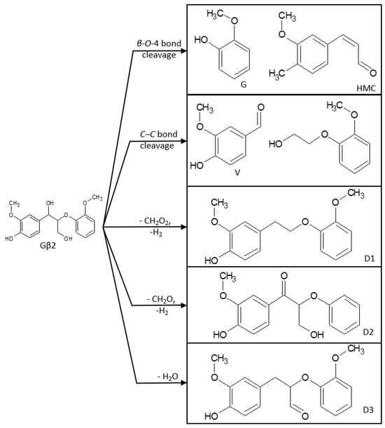 As seen in Figure 3, HMC produced from Gβ2 decomposition was detected at all three temperatures, signifying that the Cβ–O bond was cleaved. Furthermore, G (which is the other product of the target bond cleavage) was also present among products, confirming that the Cβ–O bond is cleaved during the decomposition process. However, the other observed products, D1, D2, and D3, retained the Cβ–O bond. In line with previous studies, V was also identified as a significant product [14].
