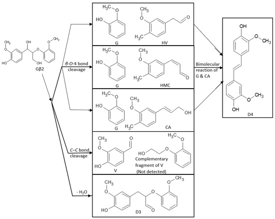 Based on the observed molecular ions as protonated or sodium adducts (Table 3) detected with high-resolution TOF, we proposed the breakdown pathways shown in Scheme 3. Three different pathways appear to take place. First, there is the cleavage of a C–C bond, which resulted in producing V. Only traces of corresponding fragment were observed. Second, there is the cleavage of the targeted C–O ether bond, that resulted in G and HMC production. Several modified Gβ2 products formed with bond cleavages only in side chains, i.e., dimers, D1–D3, were also observed.