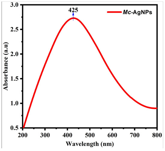 The aqueous leaf extract of M. cymbalaria was mixed with an AgNO3 solution and initially turned into a pale yellow color. Then, after incubation at 8 h, the solution turned dark brown, indicating the synthesis of Mc-AgNPs. Similar observations were reported by other investigators who used plant extracts as a reducing agent [72,73]. Further, the UV-Vis spectroscopy, widely employed for identifying the structural properties of nanoparticles, revealed a distinct peak at 425 nm, indicating the broad size distribution and presence of AgNPs on the surface of the nanoparticles in the solution (Figure 2). This peak is attributed to the surface plasmon resonance of electrons [74]. The transformation of silver ions into silver nanoparticles began as soon as the reaction was initiated, with the complete reduction occurring within about two minutes at ambient conditions, which signifies the quick biosynthesis of the silver nanoparticles [75].