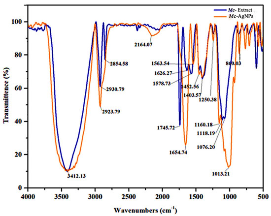 The chemical composition and functional groups present in Mc-AgNPs were investigated using FT-IR spectroscopy. The probable biomolecules responsible for the capping and reduction of silver nanoparticles were determined using FT-IR spectroscopy. Figure 3 displays the FT-IR spectrum for the Mc aqueous extract and Mc-AgNPs. The strong and broad absorption peak observed at 3412.13 cm−1 represents the O-H stretching of water molecules. The characteristic peaks at 2930.79 cm−1 and 2854.58 cm−1 are attributed to C-H stretching vibrations [14]. The peak at 2923.79 cm−1 corresponds to the medium C-H stretching of alkanes. The absorption at 2164.07 cm−1 is indicative of the strong C-N stretching of thiocyanate. The peaks at 2387.24 cm−1, 2059.09 cm−1, and 1745.72 cm−1 correspond to strong C=O stretching in the compound. The smaller peaks at 1626.27, 1403.57 cm−1, and 1654.74 cm−1 are credited to the medium C=C stretching of disubstituted alkenes (cis) and medium O-H bending and medium C=N stretching of imines/oximes. The functional group C=C stretching of cyclic alkenes was observed at 1563.54 cm−1. The minor peaks at 1250.38 and 1118.19 cm−1 were strongly related to the C-O stretching of aromatic esters and aliphatic/aryl ethers, respectively. The C-N stretching of amine groups was recorded at 1160.18 cm−1. The sharp peaks at 1076.20 cm−1 correspond to the strong C-O stretching of primary alcohols. The presence of flavanones and terpenoids in the plants are evidenced by the absorption by AgNPs, confirmed by the presence of carbonyl (C=O) groups. These carbonyl groups strongly bind to AgNPs and act as stabilizing molecules [76].