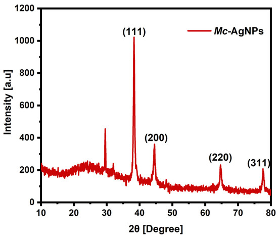 The crystallographic characteristics of the Mc-AgNPs were determined through X-ray diffraction (XRD) analysis. The XRD spectrum highlighted several distinct peaks corresponding to the Bragg reflections, notably at 2θ angles of 38.15°, 44.48°, 64.56°, and 77.64°. These peaks were attributed to the (111), (200), (220), and (311) lattice planes, respectively, as shown in Figure 4. These lattice planes indicate the face-centered cubic (F.C.C.) structure, confirming the crystalline nature of the Mc-AgNPs, which is in alignment with the standard JCPDS card no: 84-0713. The presence of these peaks suggests that the plant-based synthesis approach yields well-defined crystalline nanoparticles, likely due to the presence of natural stabilizing compounds in the plant extracts that aid in maintaining the structural integrity of the nanoparticles. Comparative analysis suggests that the diffraction patterns of the Mc-AgNPs show remarkable similarity to those reported for nanoparticles synthesized using Euphorbia antiquorum and Corallocarpus epigaeus, which exhibit analogous diffraction features corresponding to the same indexed planes [77,78]. This similarity underscores a consistent crystalline structure among plant-mediated synthesized silver nanoparticles [79].