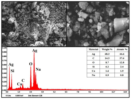 The SEM analysis was used to determine the size and shape of the Mc-AgNPs. According to the SEM analysis, the synthesized Mc-AgNPs had a cluster-like shape and significantly agglomerated. The SEM analysis of Mc-AgNPs is shown in Figure 5. Additionally, the dehydration that occurred during sample preparation for SEM analysis most likely contributed to the substantial aggregation of the biosynthesized AgNPs [80]. E.D.X. analysis determined the elemental makeup, atomic composition and weight percentage of the Mc-AgNPs. The E.D.X. analysis of Mc-AgNPs is shown in Figure 5. The study revealed certain contaminants, including carbon, oxygen, silicon, and very minute amounts of calcium and sodium. Oxygen and carbon were also present in the spectra. These elements were found to be essential for stabilizing and reducing biosynthesized AgNPs and were associated with the organic substances of the leaf extract on the surfaces of Mc-AgNPs [81].