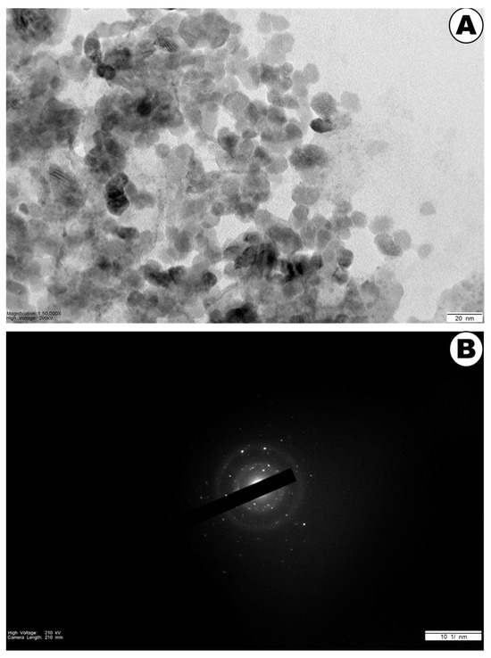 Figure 6A displays the HR-TEM analysis of Mc-AgNPs. Most of the nanoparticles had a spherical shape in their morphology. It was discovered that some of the nanoparticles had an oval or elliptical shape. It is uncommon for biological systems to produce nanoparticles with varying degrees of sphericity and dimensionality. The noticeable distinction of lighter edges compared to the centers of the particles led researchers to hypothesize that proteins or other biomolecules enveloped the Ag nanoparticles [82]. HR-TEM examination revealed that most particles had a size of around 16 to 22 nm. Figure 6B presents an overview of the SAED pattern for the Mc-AgNPs. The synthesized silver nanoparticle (AgNP) crystallinity was confirmed through selected area electron diffraction (SAED) pattern analysis. The diffraction rings observed in the SAED patterns corresponded to the (111), (200), (220), and (311) planes, which are indicative of the fcc lattice structure commonly associated with Mc-AgNPs. This observation perfectly correlated with the XRD results, underscoring the spherical and crystalline nature of the NPs. High-resolution SAED images further substantiated the crystalline structure of the AgNPs, as demonstrated by the clear and consistent diffraction patterns across multiple magnifications [83].