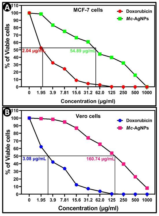 Determination of the IC50 value for Mc-AgNPs and Dox via an MTT assay; (A) MCF-7 cells (B) Vero cells.