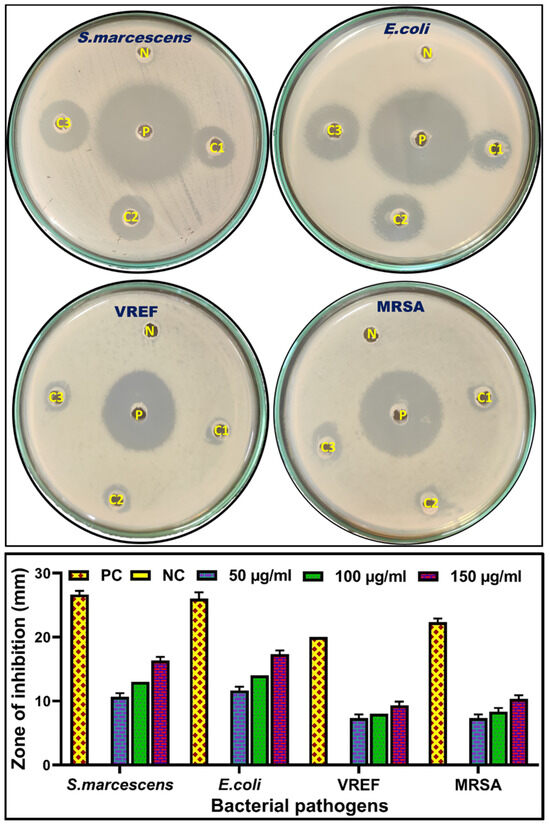 Multi-drug resistance has been a significant obstacle to promising antibiotic therapeutics and necessitates the development of a medication with nanoforumulations to tackle resistant bacterial strains [92]. In this study, the antibacterial activity of biosynthesized Mc-AgNPs was evaluated by using the well-diffusion method, against a selection of four bacterial pathogens: Gram-positive (E. coli ATCC-25922, and S. marcescens ATCC-27137) and Gram-negative (MRSA ATCC-43300, and VREF ATCC-49624). Concerning the zone of inhibition for each strain of bacteria, Mc-AgNPs exhibited a significant level of inhibition of E. coli, followed by S. marcescens, MRSA, and VREF, respectively. The maximum zone of inhibition observed for E. coli at the highest dose of Mc-AgNPs was 17.33 mm (Figure 10). Mc-AgNPs exhibited dose-dependent antibacterial efficacy against all the bacterial pathogens. In the present study, the inhibitory action of Mc-AgNPs was comparatively low for Gram-negative bacteria. This difference in susceptibility is often attributed to the structural variations in the cell walls of these two types of bacteria [93]. Gram-positive bacteria have a thick peptidoglycan layer in their cell walls, making them more susceptible to the action of nanoparticles. On the other hand, Gram-negative bacteria have a thinner peptidoglycan layer and an outer membrane made up of LPS, lipoproteins, and phospholipids that act as a penetration barrier and only permit the entry of macromolecules [94]. The silver ions from the nanoparticles are attracted to the negative charge of the bacterial cell wall. When they encounter electrostatic attraction, they migrate and bind to the bacterial cell wall, influencing the permeability of the cell wall and altering its structure [75]. The DNA of microorganisms loses its ability to replicate and to produce cellular proteins, such as ribosome subunits. After exposure to Ag+ ions, most of the enzymes necessary to produce ATP become inactive [95]. In our study, chloramphenicol was used as a positive control. The synthesized Mc-AgNPs had low antibacterial efficacy, when compared to chloramphenicol. Contreras and Vazquez (1977) reported that chloramphenicol inhibited translation by preventing the peptidyl transferase reaction or translocation step on the 50S component of the bacterial ribosome [96].