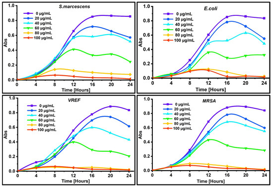 Microbial growth assays were conducted to evaluate the bactericidal activity of Mc-AgNPs against MRSA, VREF, E. coli, and S. marcescens. Bacterial isolates, numbering approximately 107 colony-forming units (CFUs), were exposed to varying concentrations of Ag-NPs (100, 80, 60, 40, and 20 µg/mL) and cultured on Mueller-Hinton agar (MHA) plates. Following treatment, a notable reduction in the colony count was observed for all four pathogens after 24 h, particularly with concentrations of 60 and 80 μg/mL of Mc-AgNPs. The observed reduction in colony numbers suggests the bactericidal efficacy of AgNPs against the tested microbial strains (Figure 11). The mechanism of action of Mc-AgNPs involves anchoring to the bacterial cell wall at multiple sites, followed by penetration and the induction of structural changes. This process leads to cell wall perforations, resulting in intracellular substance leakage [97]. Dizaj et al. (2014) suggested that AgNPs interact with the cell wall, causing disruptive effects [98]. Moreover, upon penetration, Mc-AgNPs release silver ions, which, in turn, generate reactive oxygen species. This oxidative stress affects membrane proteins and disrupts the electron transport chain [99]. The cumulative effect of these processes contributes to the observed bactericidal activity of Mc-AgNPs against bacteria, providing insights into their potential as antibacterial agents.