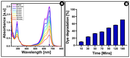 The environmental concern of the photocatalytic nature and efficiency of the synthesized nanocomposite was evaluated effectively. Figure 12A shows the UV-Vis absorption spectra of an organic dye molecule, like methylene blue, when exposed to sunlight with a maximum light intensity of approximately 860–980 lux from 11.30 am to 2.30 pm. The sample solutions were collected at several time intervals, such as 0, 10, 30, 50, 70, 90, 120, and 180 min, in the presence of Mc-AgNPs nanocomposites as the photocatalysts. Decolorization was observed during the degradation study and may be due to damage to the sulfur-nitrogen bonds in the MB solution. After the degradation study, CO2 and H2O were formed along with degraded products. From the studies, the maximum photodegradation percentage obtained for methylene blue for each sample in the presence of the synthesized catalyst, Mc-AgNPs, was found to be around 60%. The photodegradation percentage values of MB dye in the presence of the Mc-AgNPs nanocomposites after 180 min of exposure are shown in Figure 12B. From Table 3, Mc-AgNPs have higher photocatalytic activity against M.B. dye than some other reported plant-mediated silver nanoparticles.