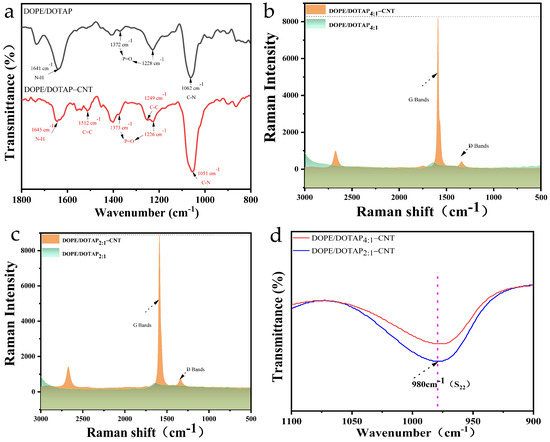 The FTIR spectra of the different liposomes are shown in Figure 1a. Both the DOPE/DOTAP liposomes and the DOPE/DOTAP-CNT liposomes exhibited absorption peaks typical of lipids. In detail, the peak at 1062 cm−1 was assigned to the CN stretching of the primary amine. The peaks at 1228 cm−1 and 1372 cm−1 were assigned to the P=O stretching of phosphates provided by the DOPE lipid [16]. Additionally, the major peak at 1641 cm−1 originated from the NH bending and the abundance of DOTAP lipid in DOPE-DOTAP [17]. After the insertion of the CNTs, two new peaks appeared at 1512 cm−1 and 1249 cm−1, which were attributed to the C=C vibration in the backbone of the carbon nanotubes and the C–C vibration mode of the CNTs. It was noticed that the insertion of the CNTs induced the red/blue shift of the absorption peaks of the lipids, indicating complex interactions between the lipids and CNTs [18,19]. The Raman spectra of the DOPE/DOTAP liposomes and DOPE/DOTAP-CNT liposomes are displayed in Figure 1b,c. The characteristic signals of the G-band and D-band of the CNTs were observed clearly at 1590 cm−1 and 1340 cm−1, and the signal intensities of the G-band and D-band of the DOPE/DOTAP2:1-CNT liposomes were higher than those of the G-band and D-band of the DOPE/DOTAP4:1-CNT liposomes, which suggests that more CNTs were combined with the DOPE/DOTAP2:1 liposomes [20]. Additionally, the near-infrared (NIR) absorbance (Figure 1d) in the 980 nm region corresponding to the S22 transitions in the CNTs further demonstrated that positively charged lipids (DOTAP) increased the quantity of CNTs inserted into the liposomes, as DOPE/DOTAP2:1-CNT exhibited a higher signal intensity [21,22].