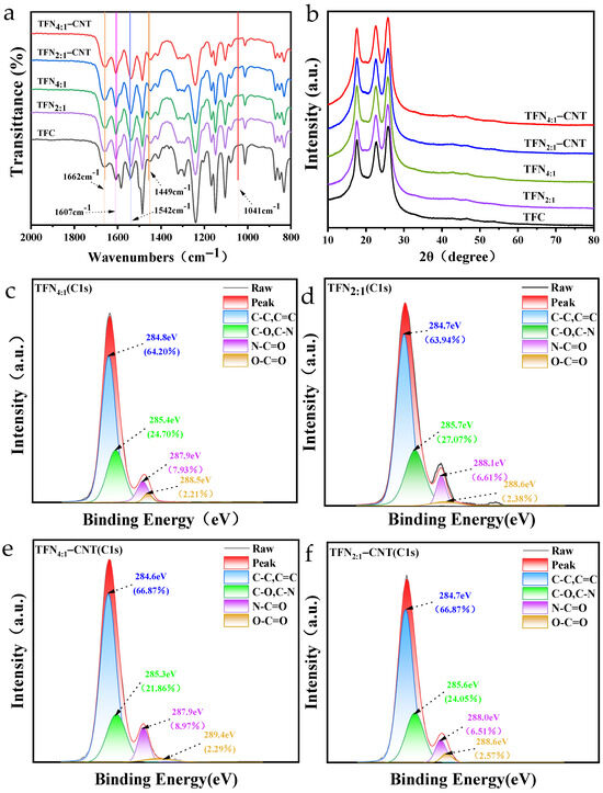 Figure 2c–f display the surface functional groups after fitting the C1s peak characterized by XPS. As shown, the C1s can be deconvoluted into C–C/C=C (284.6~284.8 eV), C–O/C–N (285.3~285.7 eV), N–C=O (287.9~288.1 eV) and O–C=O (288.5~289.4 eV), which are typical functional groups of the PA layer [28,29]. It should be emphasized that the content of surface COOH that transformed from the residual acyl chloride group was essential in influencing the membrane hydrophilicity and membrane permeability. As determined from the XPS results, compared with the TFN4:1 and TFN4:1-CNT membranes, the TFN2:1 and TFN2:1-CNT membranes presented a slightly higher content of COOH on the membrane surface, which was mostly caused by the greater amount of positively charged DOTAP that interfered with the IP process. Of note, the insertion of CNTs induced a further slight increase in the content of COOH on the membrane surface (2.38% for the TFN2:1 membrane to 2.57% for the TFN2:1-CNT membrane).