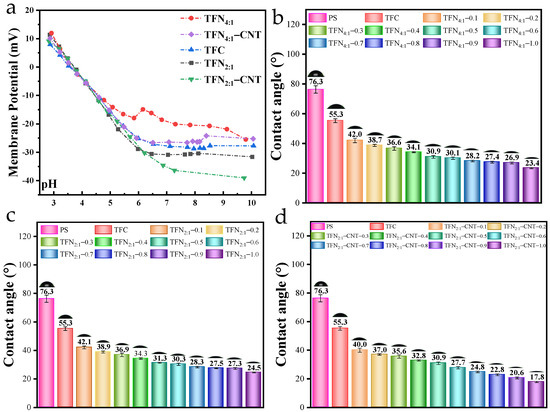 Membrane potential (a) and surface hydrophilicity (b–d) of TFC and TFN membranes.