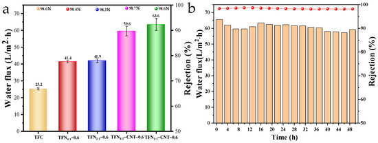 Separation performance of TFC and TFN membranes (a) and stability of TFN2:1-CNT-0.6 membranes during 48 h RO test (b).