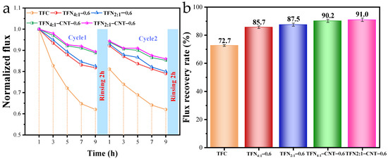 Decrease in water flux under antifouling test (a), FRR of TFC and TFN membranes (b).