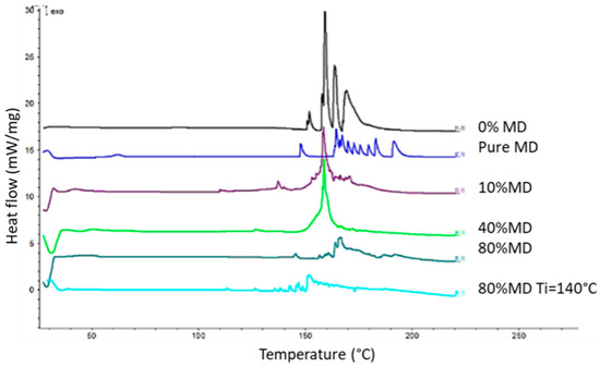 Differential scanning calorimetry (DSC) was used to determine the glass transition temperature, monitor physical and chemical transformations, and study interactions between components and the carrier. Pure maltodextrin had a Tg of 66.6 °C (Table 1), and higher amounts of maltodextrin increased Tg, improving drying efficiency and reducing stickiness. The thermograms presented in Figure 1 display a series of thermal events represented as peaks during the sample heating process. DSC curves showed differences in peak positions and intensity due to water content, moisture levels, and material structure variations caused by interactions with the carrier [32]. Upon comparing the DSC curves of the tested samples, it is evident that an increase in the proportion of MD correlates with an increase in the Tg value. The results indicate that the most notable change occurred with the addition of 10% MD as a carrier, but concentrations above 10% did not significantly raise the glass transition temperature.