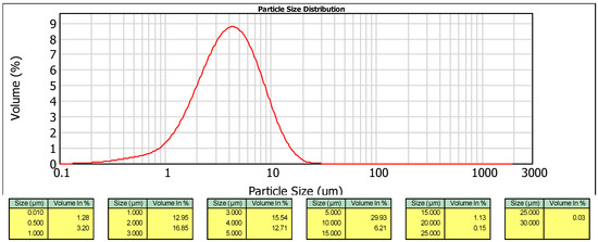 The spray drying process of the subcritical aqueous extract of A. ursinum resulted in the formation of micro-sized particles. The particle size distributions of the encapsulate can be observed in Figure 2. It is evident that the encapsulate particles exhibited a monomodal distribution, with a D[4,3] (volume mean diameter) of 4.799 µm. The low Span value of 1.906 indicates a narrow size distribution and good uniformity of the encapsulated extract particles. The median volume diameter, d(0.5), reveals that 50% of the encapsulated volume comprises particles larger than 4.012 μm. Additionally, 10% of the encapsulated volume consists of particles larger than 9.147 μm (d(0.9)), while 10% of the encapsulated volume contains particles smaller than 1.502 μm (d(0.1)).