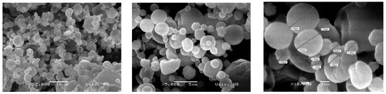 The morphology of the spray-dried powders was investigated using SEM (Scanning Electron Microscopy). Figure 3 presents the size and morphology of the encapsulated powder obtained at a temperature of 140 °C with an 80% MD content. The SEM micrographs reveal the typical characteristics of spray-dried powders, with the presence of various sizes of micropowder particles, all measuring less than 10 µm. The obtained powders exhibited an almost spherical shape with minor surface indentations, as depicted in Figure 3. These surface irregularities are commonly observed in samples prepared through the spray-drying technique. They can be attributed to shrinkage during the drying process caused by solvent evaporation and cooling [36]. Previous research has demonstrated that the spray-drying process can effectively transform large-sized raw maltodextrin (MD) particles, which have an irregular needle shape, into small individual particles that are nearly spherical and have a smooth surface, which indicates that spray drying is a suitable method for modifying the morphology and characteristics of MD particles [19]. Nevertheless, the absence of wall cracks and cavities on the surface of the microcapsule confirmed that the encapsulation had been performed effectively.