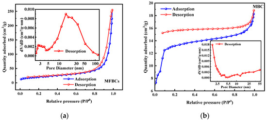 Figure 1 shows the nitrogen adsorption–desorption isotherms and pore size distribution of MFBCs and MBC. According to the Brunauer–Emmet–Teller theory, MFBCs exhibit type IV isotherms in the relative pressure range of 0.1–0.9, indicating that MFBCs are mesoporous [13]. The results showed that the adsorption capacity of MFBCs and MBC gradually increased with the increase in relative pressure, and the adsorption/desorption curve of the MBC in the low-pressure region (0.15–0.40 relative pressure (P/P0)) showed a significant increase, indicating that MBC contains more abundant mesoporous and microporous structures than MFBCs [14].