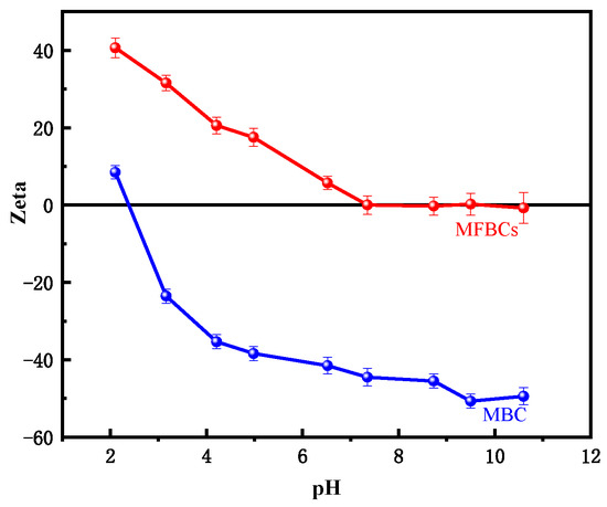 Figure 2 shows the zeta potential versus pH curves for BC and MFBCs. From Figure 1, the zeta potentials (pHzpc) of BC and MFBCs were 2.35 and 7.66, respectively, which shows that the zeta potential of the modified MFBCs was significantly increased compared to BC, indicating that MFBCs has a more significant surface hydroxyl density and protonated hydroxyls present a stable positive charge over a wide pH range and will enhance phosphate adsorption by electrostatic attraction [17].