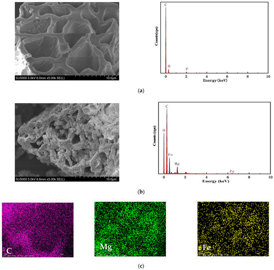 The SEM and EDS characterization results of BC and MFBCs are displayed in Figure 2. From Figure 3a, it can be seen that the surface and inner wall of BC are smooth with a prominent pore structure, which mainly consists of C and O elements and contains a small amount of P. From Figure 3b, it can be seen that the surface and the inner part of the pores of MFBCs are covered with metal oxides, which improves the specific surface area, increasing the active sites and the chance of binding with pollutants. Prominent peaks of Fe and Mg elements appeared in the EDS energy spectrum, and the elemental distribution map (c) showed that Fe and Mg were uniformly dispersed in MFBCs, indicating that Fe and Mg were successfully loaded on the mulberry stick biochar.