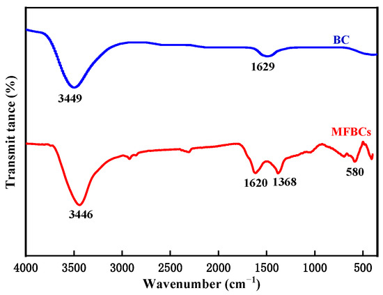 The results of the FT-IR analysis of BC and MFBCs are shown in Figure 4. From Figure 4, it can be seen that BC and MFBCs have characteristic peaks at 3449 cm−1, 1629 cm−1 and 3446 cm−1, 1620 cm−1, respectively. According to the corresponding profiles of infrared functional groups, it can be seen that the broad bands at 3446 cm−1 and 3449 cm−1 indicated that the occurrence of water molecules and O-H bonding in the upper layer and the Mg-Fe/LDH intercalation layer was caused by the stretching-type vibrations of the groups [18]. There are C=O stretching vibration peaks at 1680–1630 cm−1; the peak at 1620 cm−1 is related to the bending mode of the water molecules in the interlayer, and the peak of MFBCs at 1368 cm−1 suggests the presence of the asymmetric stretching of the carbonate molecules in the layer [19]. In addition, the characteristic peaks at 587 cm−1 indicated the presence of the asymmetric stretching of carbonate molecules associated with the mixed-metal oxide (Fe-O or Mg-O or MgFe-O)-related adsorption bands [20], thus indicating the successful synthesis of Mg/Fe-LDHs.