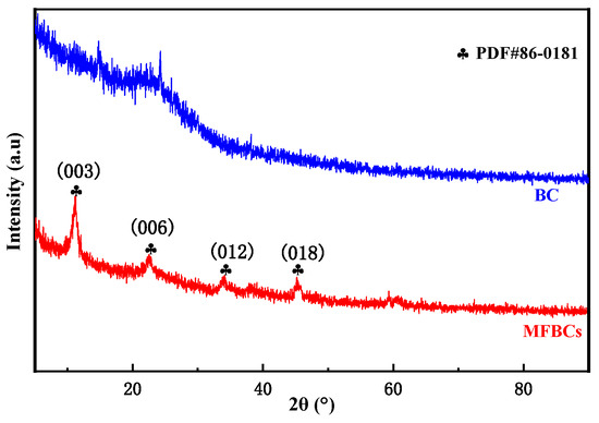 Figure 5 shows the XRD patterns of BC and MFBCs. Compared with BC, MFBCs have the characteristic diffraction peaks of Mg/Fe-LDHs, including the typical planes of (003), (006), (012), and (018), which proved the formation of the LDH phase, indicating that the Mg/Fe-LDHs were synthesized efficiently and loaded on mulberry stem biochar sucessfully.