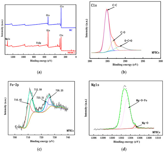 Figure 6 shows the XPS images of BC and MFBCs; as can be seen in Figure 6a, the BC surface is mainly composed of C and O elements, and the MFBCs surface has Mg and Fe elements in addition to C and O. There is no obvious change in the binding energy positions of C 1s and O 1s. Still, the peak at O 1s is significantly enhanced, indicating that the content of metal (hydro)oxides or oxygen-containing functional groups has increased due to the modification [21]. MFBCs show peaks at 700.18–739.98 eV for Fe 2p and 1296.18–1308.98 eV for Mg 1s. From Figure 6b, the peaks of C 1s in MFBCs appeared at 284.8 eV, 286.5 eV, and 288.6 eV for C-C, C-O, and O-C=O, respectively. According to Figure 6d, the Mg 1s spectrum is mainly Mg-O-Fe (1303.33–1303.81 eV), indicating that magnesium in MFBCs exists in oxide form. Figure 6c shows that the position of the Fe 2p 3/2 characteristic peak is at 711.49 eV, and its sub-peak contains the characteristic peak of trivalent iron of Fe2O3 (712.58 eV).