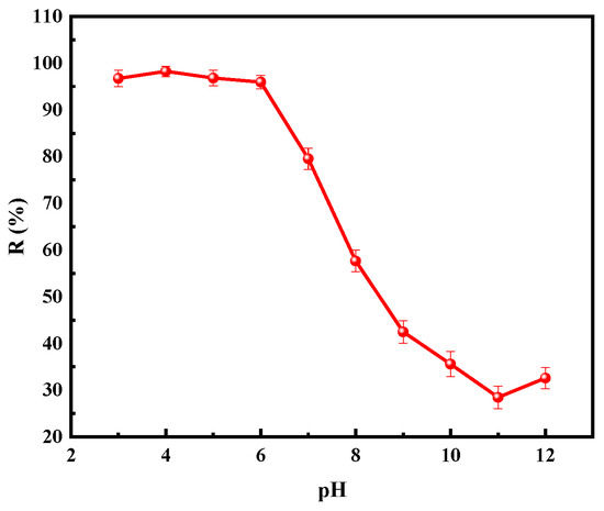 The initial phosphorus concentration was 20 mg·g−1, and 2 g·L−1 of MFBCs was put into 50 mL of phosphorus-containing synthetic wastewater with solution pH of 3, 4, 5, 6, 7, 8, 9, 10, 11, and 12, respectively. The residual phosphorus concentration was determined when the solution was shaken to adsorption equilibrium at 298 K using a thermostatic water bath oscillator. Phosphorus adsorption qe [Equation (1)] and removal rate R % [Equation (2)] are as follows: