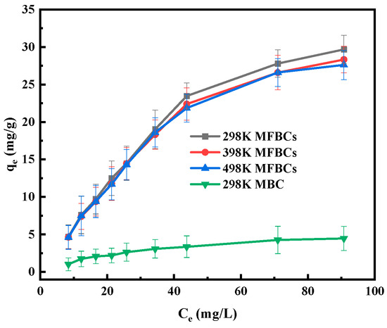 where qe is the amount of phosphorus adsorbed by MFBCs at the equilibrium moment, mg·g−1; C0 is the initial phosphorus concentration in the solution, mg·g−1; Ce is the concentration of phosphorus in the solution at the time of adsorption equilibrium, mg·g−1; V is the volume of the solution, L; and m is the mass of MFBCs, g.