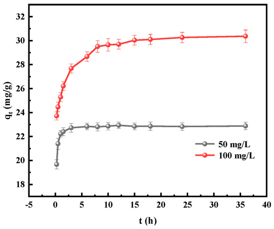 The adsorption kinetic curve of MFBCs on phosphorus is shown in Figure 10. With the increase in reaction time, the adsorption amount first increased rapidly and then increased slowly until the adsorption equilibrium was reached, which was because as the reaction proceeded, the adsorption sites on the adsorbent surface available for binding gradually reduced, and the rate of mass transfer was slowed down until the binding sites were all occupied and the reaction reached equilibrium. The adsorption reaction reached equilibrium at about 5 h when the initial phosphorus concentration was 50 mg·g−1, and the adsorption equilibrium time was prolonged and reached equilibrium at about 20 h when the initial phosphorus concentration increased to 100 mg·g−1.