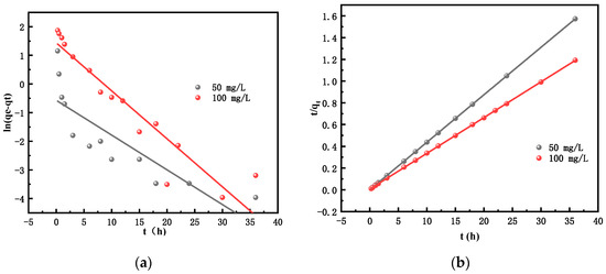 The initial phosphorus concentrations were set at 50 and 100 mg·L−1, and 0.1 g of MFBCs was added to 50 mL of phosphorus-containing synthetic wastewater, the pH of the solution was adjusted to 4.0, and the residual phosphorus concentrations were determined at different periods of 0.25, 0.5, 1, 1.5, 3, 5, 7, 10, 12, 15, 18, 24, 36, and 48 h. The residual phosphorus concentrations were determined at different periods of 0.25, 0.5, 1, 1.5, 3, 5, 7, 10, 12, 15, 18, 24, 36, and 48 h. The residual phosphorus concentrations were determined at different times. The adsorption process was fitted using quasi-primary and quasi-secondary kinetic models with the linear expressions of [Equations (5) and (6)].