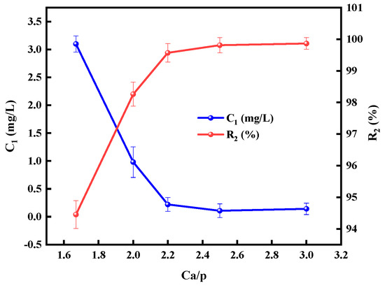 The effect of different calcium–phosphorus ratios on phosphorus recovery is shown in Figure 12. It can be seen that as the calcium–phosphorus ratio increases, the phosphorus concentration in the desorbent decreases, and the phosphorus recovery R2 increases. When the calcium–phosphorus ratio increased from 1.67 to 2.2, the phosphorus concentration C1 in the desorbent decreased rapidly from 3.104 mg·L−1 to 0.194 mg·L−1, and the phosphorus recovery R2 increased from 94.45% to 99.64%, which was basically able to completely recover the phosphorus in the desorbent, and continued to increase the calcium–phosphorus ratio, the phosphorus concentration and the recovery did not change significantly.