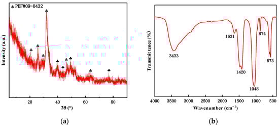 The FT-IR spectrum of the recovered phosphorus product is shown in Figure 13b, which indicates that there is a telescopic vibrational absorption peak of OH− at 3433 cm−1, and the ν3 vibrational peaks of PO43− in hydroxyapatite appeared at 1010–1110 cm−1, while the ν4 and ν1 vibrational peaks of PO43− in hydroxyapatite appeared at 560–610 cm−1. The absorption peaks generated by the splitting of the ν3 telescopic vibration peak of CO32− appeared near 1420 cm−1, and ν2 was located at 874 cm−1, all of which are the characteristic peaks of hydroxyapatite [33,34]. In addition, the presence of the C=C telescopic vibration at 1631 cm−1 [35] further suggests that the recovered phosphorus, whose main constituent is hydroxyapatite, is a more desirable recycled product.