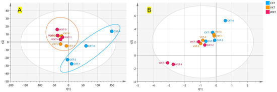 As shown in the fingerprints (Figure S6), processing had no impact on triterpenoid and lignan levels in the Xuetong sample. However, catechin compounds (X2–X7) noticeably decreased in content after processing. No distinct differences in chemical composition were observed between vinegar-processed and wine-processed samples. These results were further confirmed by PLS-DA analysis (Figure 5), where significant differences were observed between unprocessed (CXT) and processed samples (WXT and VXT) for the major components in F1.