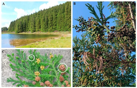 Azorean Cryptomeria japonica: (A) woodland; (B) aerial plant part; and (C) fresh female cones at immature and mature stages, as highlighted by a circle to the left and right sides, respectively.