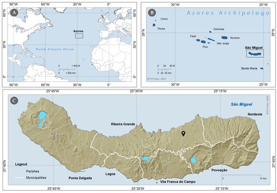 Geographical location of the collection area of Cryptomeria japonica female cones: (A) the Azores Archipelago in the northern Mid-Atlantic Ridge highlighted by a square; (B) São Miguel Island in the Azores Archipelago highlighted by a square; and (C) the collection site marked with a black pin (maps from Faculty of Science and Technology, University of the Azores, 2024).