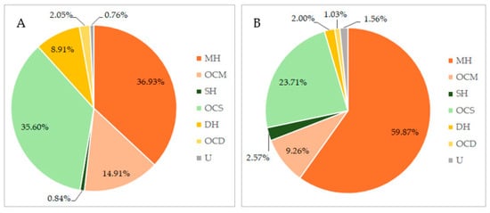 Percentage of grouped components of essential oils isolated by hydrodistillation from Azorean Cryptomeria japonica female cones: (A) immature female cones and (B) mature female cones (data from Janeiro et al. [16]). Legend: MH—monoterpene hydrocarbons; OCM—oxygen-containing monoterpenes; SH—sesquiterpene hydrocarbons; OCS—oxygen-containing sesquiterpenes; DH—diterpene hydrocarbons; OCD—oxygen-containing diterpenes; and U—unidentified components.