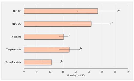 The results of the BSLA of the EO samples, as well as of some their components, are shown in Figure 4. The IFC EO was found to be more toxic than the FMC EO, with 28.3 ± 7.6% and 25.8 ± 7.5% mortality rates (at 100 μg/mL), respectively, although there were no significant differences between them. Regarding the EOCs tested, terpinen-4-ol, one of the major components in both EO samples (Table 1), also displayed some toxic activity (17.42 ± 3.94%), followed by α-pinene (15.2 ± 1.7%), the most abundant component in both EO samples (Table 1), and bornyl acetate (10.6 ± 3.4%), which did not seem to be involved in toxicity against the A. salina nauplii. The preliminary results of the BSLA assay show that both the IFC and MFC EOs may contain some bioactive components, which should be considered for further investigations of their potential pharmacological properties. These results are in accordance with previous findings [15].