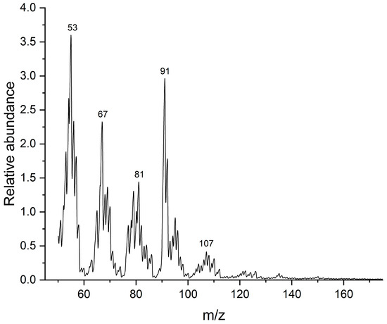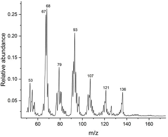 TKS seeds were also subjected to qualitative analysis using PY-MS. TKS seeds from different regions were placed in the pyrolysis cup and introduced into the PY-MS. The resulting mass spectra, as shown in Figure 4, reveal that the mass spectrum of TKS seeds closely resembles that of natural rubber, but it differs in certain aspects when compared to the mass spectrum of the TKS reference material, as shown in Figure 2. Notably, the mass spectrum of TKS seeds lacks the characteristic peak of the isoprene ion at m/z 68, which is present in the spectrum of the TKS reference material shown in Figure 2. And, more importantly, throughout the process before and after sampling, the ion peak intensity at m/z 136 remained nearly unchanged. Consequently, we witnessed the absence of a characteristic ion peak at m/z 136, which would indicate dimeric limonene. Additionally, the ratio of the peaks for ions with m/z 67 and 68 in Figure 4 is approximately 0.95, which is different from the ratio in Figure 2, where it is approximately 1.74. Comprehensive analysis of the TKS seed mass spectrum reveals that under the condition of solely utilizing the PY-MS detection method, characteristic rubber ion peaks may not be present in TKS seeds. This suggests that TKS seeds might not inherently contain cells responsible for rubber synthesis. Instead, these cells are likely develop during the germination and subsequent growth of the plant. This conclusion reinforces our understanding of growth, development, and biosynthesis of NR in TKS [38]. However, it may necessitate additional verification using alternative detection methods.