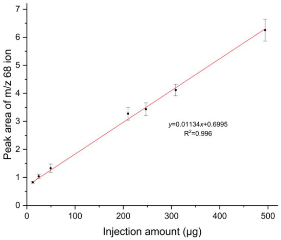 The detection limit (limit of detection, LOD) is calculated based on the signal that is three times the standard deviation (SD) of the peak noise blank. It refers to an important indicator of the sensitivity or detection capability of an analytical method. The blank sample refers to a clean pyrolysis cup to which no sample has been added. The response values of blank samples were measured ten times. The m/z 68 ion was extracted, and peak areas were calculated to obtain the standard deviation of peak area intensities. Subsequently, the method’s LOD was determined by dividing three times the standard deviation by the slope of the calibration curve, resulting in an LOD of 0.639 µg.
