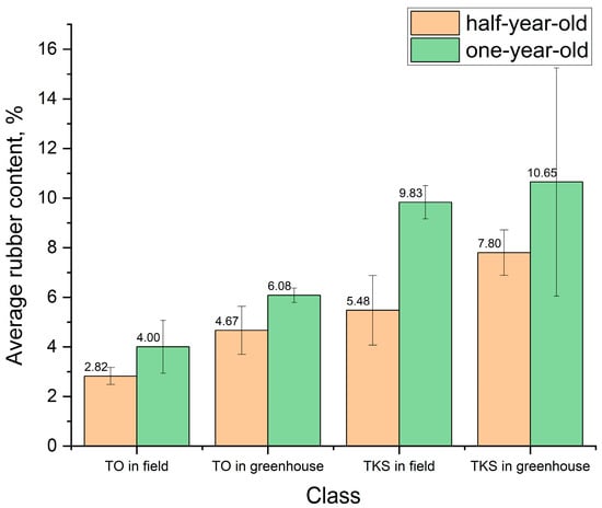 The results indicate that one-year-old TO or TKS has a higher average NR content than half-year-old ones. This is consistent with Bonner’s [39] findings that NR in plants accumulates over time. From a cultivation perspective, greenhouse-grown TO and TKS showed a higher average rubber content than field-grown ones, which might be related to the well-controlled conditions in greenhouses, as environmental factors, such as sunlight, temperature, humidity, and extreme weather, can be controlled more precisely in greenhouses. Such settings offer reduced exposure to external environmental stressors, providing more ideal conditions for plant growth. In terms of variety, although TO contains NR, the average NR content in TKS is higher, with greenhouse-grown TKS having an average NR content exceeding 10% by fresh weight according to Table 3. This is similar to the average content statistics for TKS cultivated in other countries [40,41].