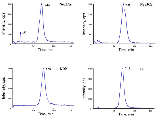 Mass detection of the analytes was evaluated using full-scan mass spectra in both positive- and negative-ion modes. Greater sensitivity was achieved for Neu5Ac, Neu5Gc, KDN, and IS in the negative mode than in the positive mode. Thus, the negative ESI mode of [M−H]− was used to yield the precursor ions of Neu5Ac, Neu5Gc, KDN, and IS. The product ion scan spectra are shown in Figure S1. To improve the specificity, an MRM scanning type was used in this analysis. The optimized MRM transitions were specific and intense for the analysis of Neu5Ac (m/z 308.1 → 86.9), Neu5Gc (m/z 324.0 → 115.9), KDN (m/z 267.0 → 87.0), and IS (m/z 311.1 → 90.0). A summary of the optimized MRM fragmentation transitions and MS parameters for each analyte is presented in Table 1.