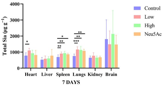 The total sialic acid components (including KDN, Neu5Ac and Neu5Gc) in individual tissues after seven days of oral administration of edible bird’s nests are shown in Figure 3. The results with significant differences have been marked. As shown in Figure 3, after the administration of edible bird’s nest and Neu5Ac, the contents of total sialic acid in liver, kidney, and brain tissues did not significantly increase, but the content of total sialic acids in the brain was about twice that of other tissues, which is consistent previous research that reports that the nervous tissue is the organ with the highest expression level of sialic acids [27].
