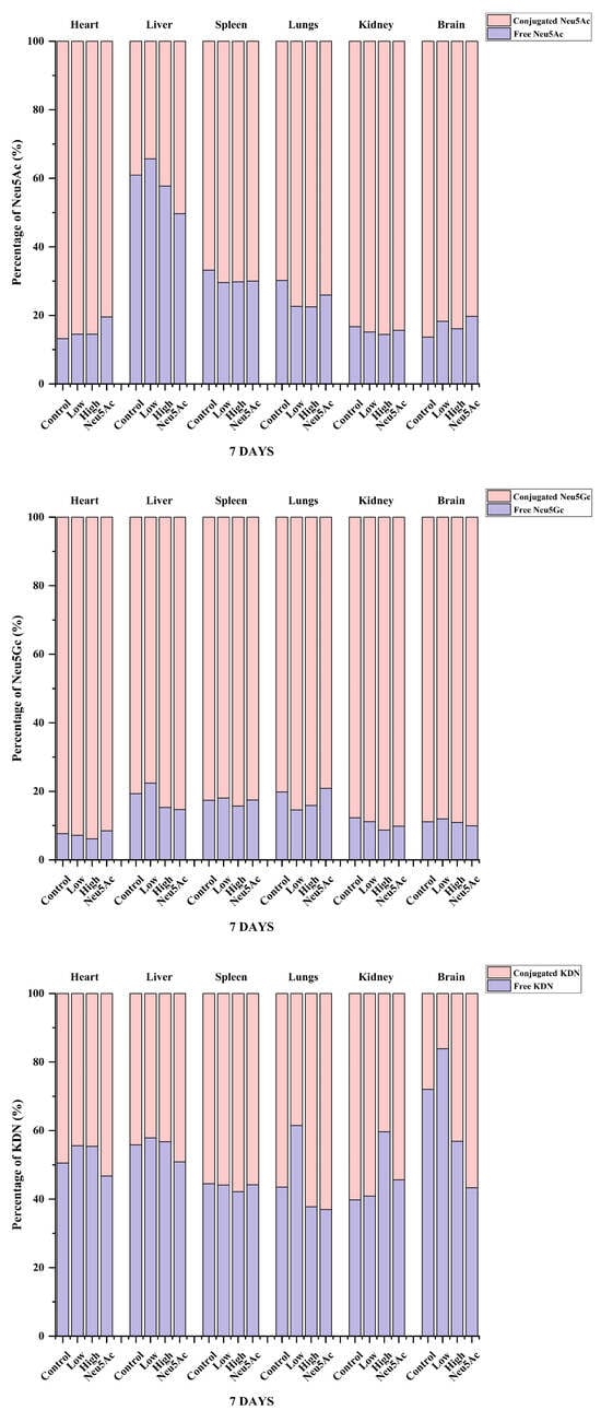 We also analyzed the proportions of the three sialic acids in different tissues after 7 days of administration and found that even after seven days of administration, the highest proportion of Neu5Ac content was found in brain tissue, higher than 97% (Figure 4). The study by Huang et al. [30] showed that the proportion of Neu5Ac in mouse pups was 91%, which was slightly different from our study, indicating that the proportion of sialic acid may be related to the strain and age of mice, and further research is needed to verify this. The content of Neu5Gc was the highest in other tissues, and the proportion was higher than 60% (Figure 4). Figure 5 shows the percentage distribution of free and conjugated forms of Neu5Ac, Neu5Gc, and KDN after administration. The form of sialic acid in pigs has been studied previously, and it was reported that the majority of Neu5Ac (76–100%) and Neu5Gc (70–100%) were conjugated in five organ tissues and skeletal tissues in 3-day-old pigs or adult pigs (180 days of age) [13]. Our study showed that the majority of Neu5Ac (67–87%) and Neu5Gc (78–94%) in different tissues of mice in the administration and control groups were conjugated (Figure 5). The only exception was that the level of free Neu5Ac in the liver accounted for 34–50% of the total Neu5Ac level (Figure 5). In contrast, the proportion of free and conjugated KDN was similar in the six tissues (Figure 5).