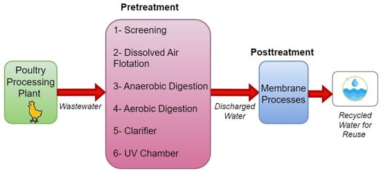 The food industry is among the top-ranked industries that are highly concerned about water consumption []. In the food industry, in particular, poultry consumes 24% of freshwater, which is the highest proportion compared to other food sectors. The largest portion of this water is utilized in the operations of slaughtering, processing, and cleaning within poultry slaughterhouse plants []. Typically, a bird consumes approximately 24.4 L of water on average []. The water consumed is saturated with proteins, fats, quills, paunch, feces, urine, blood, and other organic matter. If this poultry slaughterhouse wastewater (PSWW) is released into local water bodies untreated, the biodegradable organic matter will almost eliminate the dissolved oxygen (DO) of the surface water and may cause the death of marine life and increase algae growth and water-borne diseases [,,]. Therefore, it is necessary to treat PSWW before releasing it into the environment.